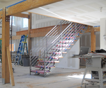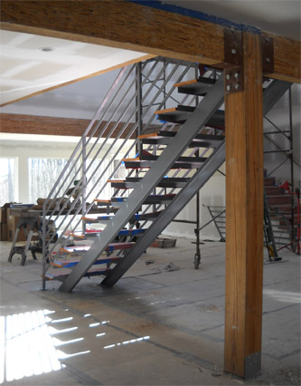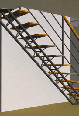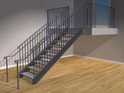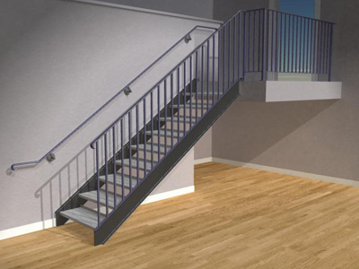 - Side Stringers: Also known as pan-type stairs, side stringers place their supports on opposite ends of the stairs. This way, there is nothing obscuring the view from behind. These stairs can go straight up to another platform, make a 90-degree turn, or double back on themselves.