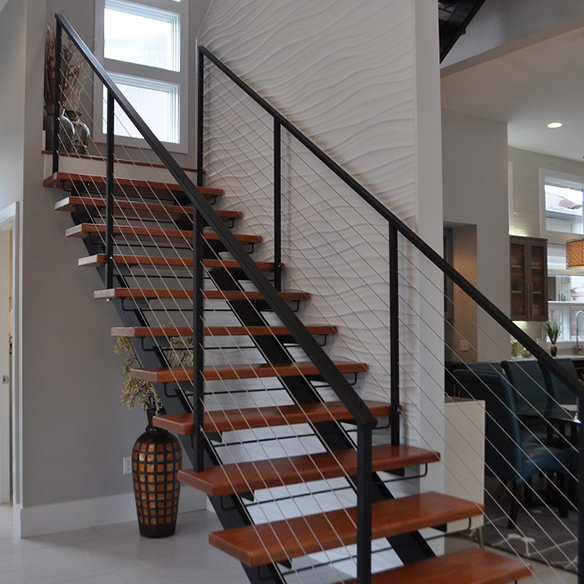 With stringers going down under the tread, set in from the edges, double stringers are both durable and affordable. They feature a modern railing system that blends well with cable rails or welded railing systems.